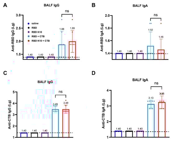 Evaluation of mucosal immune responses in bronchoalveolar lavage fluid (BALF) from mice immunized RBD K10 via pulmonary delivery. (A) Anti-RBD IgG and (B) IgA levels in BALF. (C) BALF anti-CTB IgG and (D) IgA levels. ns, p > 0.05.