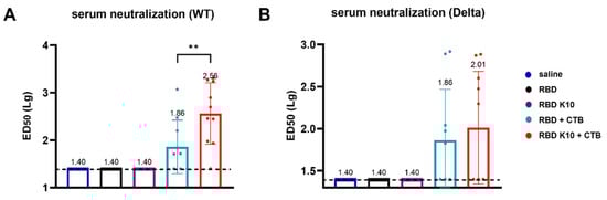 Serum neutralizing antibody activity following pulmonary delivery of RBD K10. (A) Neutralizing antibody titers against SARS-CoV-2 wild-type and (B) Delta variant pseudovirus in serum of mice immunized via pulmonary delivery of RBD K10. (n = 10) ED50: median effective dose. ** p < 0.01.