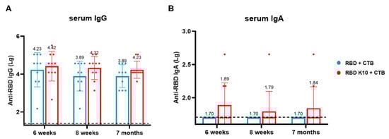 To evaluate the long-term immune efficacy of this combination following pulmonary administration, blood samples were collected, and serum was isolated from mice at two weeks, four weeks, and six months after the third immunization to measure IgG and IgA antibody titers. In the RBD K10 + CTB group, RBD-specific IgG antibody titers were 2.63 × 104, 2.09 × 104, and 1.70 × 104 at two weeks, four weeks, and 7 months, respectively, whereas the RBD + CTB group exhibited titers of 1.70 × 104, 7.76 × 103, and 7.76 × 103 (Figure 7A). Notably, no RBD-specific IgA antibodies were detected in the RBD + CTB group, while the RBD K10 + CTB group demonstrated titers of 1:78, 1:62, and 1:69 at the corresponding time points (Figure 7B). The results demonstrate that the combination of RBD and CTB sustains long-term IgG and IgA responses in serum, with the addition of 10 lysine residues to RBD (RBD K10)-enhancing immunogenicity.