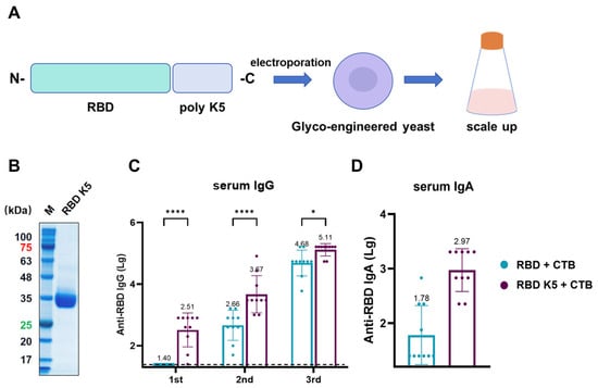 Characterization and immunogenicity of glycoengineered P. pastoris-expressed RBD K5 fusion protein. (A) Diagrammatic illustration of RBD K5 expression in glycoengineered P. pastoris. The RBD K5 fusion construct was incorporated into glycoengineered P. pastoris through electroporation, followed by extensive expression on a large scale. (B) SDS-PAGE analysis of purified RBD K5 protein. These numbers indicate the molecular weights of proteins, with red indicating a protein molecular weight of 75 kDa and green indicating a molecular weight of 25 kDa. (C) Serum IgG levels against RBD at different time points. (D) Serum IgA levels against RBD after the third immunization. * p < 0.05; **** p < 0.0001.