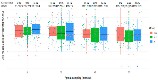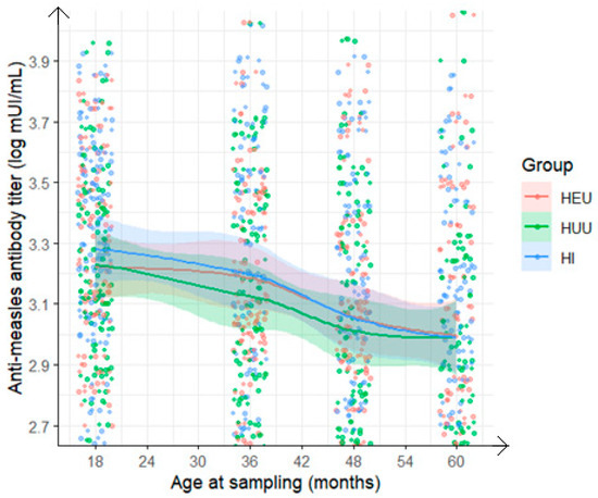 To address some of these gaps, we analyzed data from the ANRS 12225—Pediacam III cohort, which included early-treated HIV-infected children (HI) followed from birth or diagnosis (before 7 months of age), alongside two uninfected control groups: HIV-exposed uninfected (HEU) born to HIV-infected mothers and HIV-unexposed uninfected (HUU) children. Designed to reflect near-real-life conditions with structured follow-up, this study aimed to evaluate measles pre-vaccination status, immunogenicity, and the persistence of measles antibody responses across these three groups. Additionally, we compared the humoral response to the measles vaccine (MV) at different time points during the first five years of life in these groups.