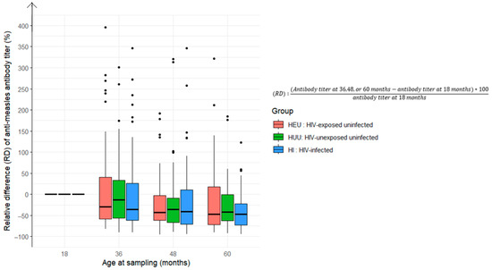 Relative difference in anti-measles antibody titers at 36, 48, and 60 months compared to baseline levels at 18 months among children who received the measles-containing vaccine at either 9 and 15 months or at 6, 9, and 15 months (HEU: HIV-exposed uninfected; HUU: HIV-unexposed uninfected; HI: HIV infected).