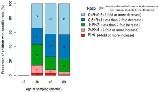 Regarding the geometric mean titer (GMT) for measles antibodies, the rate of decline varied from the 18-month baseline titer (R = 1). The proportion of children with declining measles antibody levels (0 < R < 1) progressively increased: 58% at 36 months, 74% at 48 months, and 77% at 60 months, with no differences according to HIV status (Figure 4 and Figure 5).