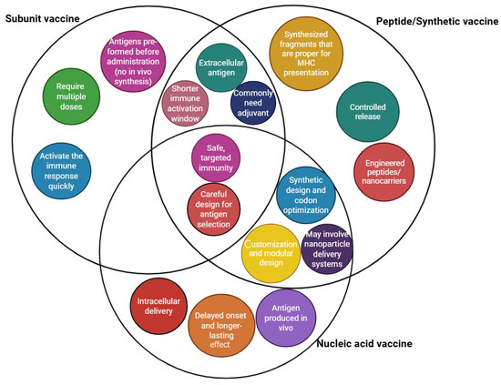 Peptide vaccines are synthesized using fragment condensation methods, and these vaccines are typically administered with an adjuvant to enhance the immune response. Additionally, these vaccines are considered safer than live or attenuated vaccines [28]. As biotechnology has advanced quickly, recombinant proteins for application in vaccines and medications have been produced by heterologous expression. As the fundamental unit of correspondence between information-carrying proteins and nucleic acids, the codon serves as the fundamental conduit for information transfer in vivo. Known as synonymous codons, they encode the same amino acid. Codon usage bias refers to the tendency of a species or a gene to favor the use of one or more specific synonymous codons, known as optimum codons, even when the usage probability of synonymous codons is not the same during protein synthesis. Additionally, the bias governing codon use by genes varies greatly, depending on the function. This phenomenon is called codon usage bias. Heterologous expression has been used to produce recombinant proteins for application in medications and vaccines, as biotechnology has advanced quickly, even though the usage probability of synonymous codons is not the same during protein synthesis [29,30]. There are also other advantages to employing the attenuation technique of codon deoptimization. A successful response to infectious epidemics requires speed, and this method has the advantage of not requiring an in-depth knowledge of viral function. The three novel aspects of vaccine technology are illustrated in Figure 1. Additionally, a summary of these three technologies is provided in a diagram highlighting their exclusive and shared features, as shown in Figure 2.