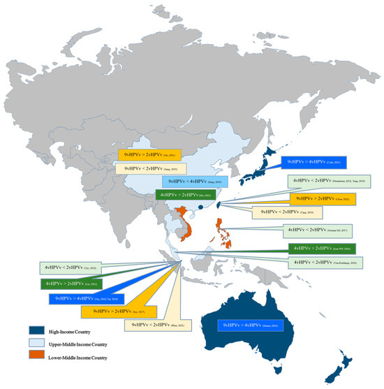 - Llave, C.L.; Uy, M.E.V.; Lam, H.Y.; Aldaba, J.G.; Yacapin, C.C.; Miranda, M.B.; Valverde, H.A.; Silva, W.T.; Nawaz, S.; Slavkovsky, R.C.; et al. The cost-effectiveness of human papillomavirus vaccination in the Philippines. Vaccine 2022, 40, 3802–3811. [Google Scholar] [CrossRef] [PubMed]
