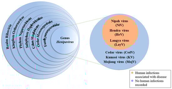 NiV belongs to the family Paramyxoviridae, subfamily Paramyxovirinae, and genus Henipavirus. The genus Henipavirus includes Hendra virus (HeV), Cedar virus, Kumasi virus, Mojiang virus, and Langya henipavirus, in addition to NiV [,] (Figure 1). NiV has only one serotype, but genetic variation has led to the evolution of two lineages of the virus during transmission, namely, the Bangladesh lineage (NiV Bangladesh, NiV-B) and the Malaysian lineage (NiV Malaysia, NiV-M), which have nucleotide similarities of up to 91.8% [].