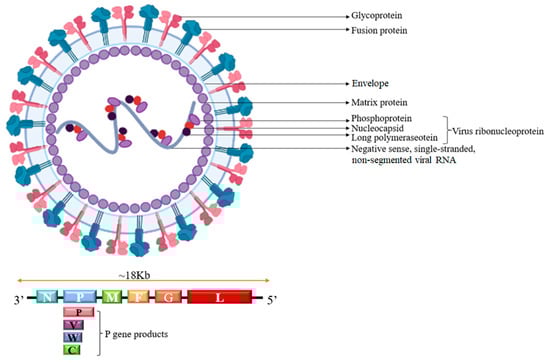 NiV is a vesicular virus with an unsegmented negative-stranded RNA genome. The virus particles are polymorphic, including spherical and filamentous forms, and range in size from 180 to 1900 nm, with an average size of 500 nm []. Like all other paramyxoviruses, the NiV genome contains six genes corresponding to the nucleocapsid (N), phosphoprotein (P), matrix protein (M), fusion protein (F), glycoprotein (G), and large protein (L) []. The two lineages of NiV are roughly the same in terms of structure and function, but they have different genome sizes. The NiV-MY genome contains 18,246 nucleotides (nts), whereas the NiV-BD genome has 18,252 nts []. The N, P, and L proteins play a role in viral replication []. The accessory proteins V/W/C are encoded through the variable open reading frame and RNA editing of the P gene, where the C protein is translated by the downstream start codon of the P mRNA. Upon insertion of a guanine at the RNA editing site, the RNA of the P gene is edited to generate the V and W genes, and the C gene is encoded in a different reading frame that regulates viral RNA synthesis. The V and W proteins are thought to suppress the innate immune response by directly blocking interferon α (IFNα) signaling []. The M protein has functional roles in viral growth and assembly, but viral entry is mediated by two glycoproteins, F and G []. Amino acid similarity between NiV and HeV ranges from 68% to 92%, with 88% and 83% similarity between the F and G proteins of the two, respectively []. Thus, NiV and HeV exhibit significant or complete cross-reactivity []. The structure and genomic arrangement of NiV are shown in Figure 2.