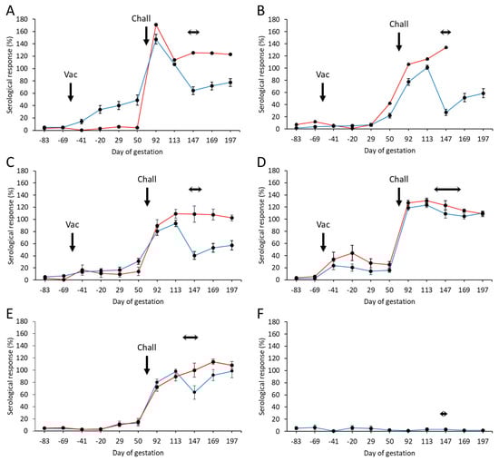 Serological responses following vaccination with different COMC/adjuvant formulations and C. abortus challenge. Detection of C. abortus antibody in ewes vaccinated (56 days prior to mating) with a single dose (Vac) of either 20 μg (A) or 2.5 μg (B–D) COMC antigen formulated with Montanide ISA 70 VG (A,B), Montanide ISA 61 VG (C), or QuilA (D) and challenged (Chall) on day 70 of gestation with C. abortus strain S26/3. Unvaccinated challenged (E) and unvaccinated non-challenged (F) ewes were included as positive and negative control groups. Data are separated into lambed (blue lines) versus aborted (red lines). Data points represent the arithmetic mean values for each cellular bleed, and error bars represent the standard error of that mean (SEM). Here, 100% is equivalent to an OD450 nm of 2.25. The lambing/abortion period for each group is indicated by the horizontal double-headed arrows. Note that the panel B aborted animal is missing the last two bleeds, as she had to be euthanized at parturition on welfare grounds.