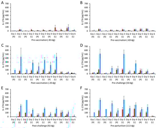 Interleukin-17A responses following vaccination with different COMC/adjuvant formulations and C. abortus challenge. Peripheral blood mononuclear cells (PBMCs) were purified from whole blood (as described in Section 2) for the vaccinated, challenge control, and negative control groups and were collected at the indicated time points (day of gestation; dg) prior to and post-mating (also see Figure 1). Bleeds were taken pre-vaccination (A,B), post-vaccination (C), pre-challenge (D), post-challenge (E), and pre-parturition (F). Antigen-specific IL-17A recall responses were assessed via analysis of culture supernatants resulting from the stimulation of purified PBMC in vitro, using medium only as an unstimulated cell control (black bars; very low relative to mitogen and antigen). UV-inactivated C. abortus EB (red bars) and COMC (vaccine antigen; blue bars) antigens were used for measuring chlamydial antigen-specific stimulation. Note that ConA data have not been included so that the EB and COMC responses can be more easily observed (see Table S2 for ConA data). Data have been separated into lambed and aborted for each group, and values represent the means for each cellular bleed, while error bars represent the standard error of that mean (SEM).