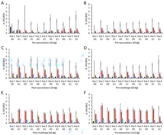 Interleukin-10 responses following vaccination with different COMC/adjuvant formulations and C. abortus challenge. Peripheral blood mononuclear cells (PBMCs) were purified from whole blood (as described in Section 2) for the vaccinated, challenge control, and negative control groups and were collected at the indicated time points (day of gestation; dg) prior to and post-mating (also see Figure 1). Bleeds were taken pre-vaccination (A,B), post-vaccination (C), pre-challenge (D), post-challenge (E), and pre-parturition (F). Antigen-specific IL-10 recall responses were assessed via analysis of culture supernatants resulting from the stimulation of purified PBMCs in vitro, using medium only as an unstimulated cell control (black bars; very low relative to mitogen and antigen) and Concanavalin A (ConA) as a positive control (grey bars). UV-inactivated C. abortus EB (red bars) and COMC (vaccine antigen; blue bars) antigens were used for measuring chlamydial antigen-specific stimulation. Data have been separated into lambed and aborted for each group, and values represent the means for each cellular bleed, while error bars represent the standard error of that mean (SEM).