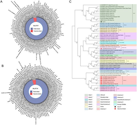 Sequence alignment and phylogenetic tree analysis of the field CDV strain HJL17. (A) Homology analysis by BLASTN programs based on the CDV F gene between HJL17 strain and 98 vaccine or field strains in GenBank. (B) Homology analysis by BLASTN programs based on the CDV H gene between HJL17 strain and 100 vaccine or field strains in GenBank. (C) Phylogenetic tree by MEGA11 software based on the H gene between HLJ17 strain and 51 representative CDV strains of 19 genotypes in GenBank.