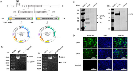 The recombinant plasmids p17F and p17H were generated using the pCAGGSΔSV40 vector platform and genetically modified HLJ17F or HLJ17H (Figure 2A). p17F and p17H were individually double-digested into bands of the expected size (Figure 2B). HEK-293 cells transfected with plasmids p17F and p17H were stained by dog anti-CDV serum (Figure 2C). p17F or p17H expression was further confirmed by western blot analysis with dog anti-CDV serum to CDV F and H proteins (Figure 2D). These results suggested that the recombinant plasmids p17F and p17H were generated, and the target proteins could be efficiently expressed.