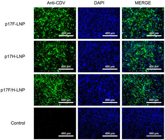 The p17F-LNP and p17H-LNP were formulated and characterized quality parameters. The concentrations of p17F-LNP and p17H-LNP were above 0.5 mg/mL, and the encapsulation efficiencies were 93.2% and 97.2%, respectively. The nanoparticle diameters of p17F-LNP and p17H-LNP were 105 nm and 104 nm, and the particle diameter indices (PDI) were 0.106 and 0.105, respectively. The cells incubated with p17F-LNP, p17H-LNP, or bivalent formulation were efficiently stained by dog anti-CDV serum (Figure 3), and the in vitro activities were all above 60% based on three independently IFA assays. The results showed that these quality parameters met the standards and could be used as vaccine candidates for further evaluation.