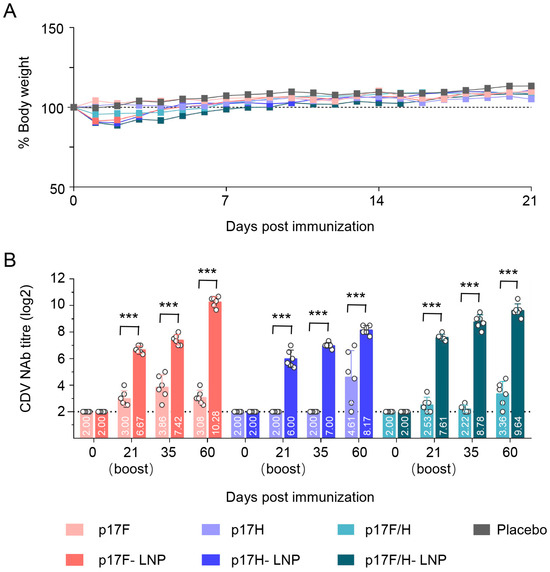 For safety and immunogenicity evaluation, 6-week-old female mice (Vital River, Beijing, China) were randomly assigned to into 7 groups, and 6 mice were used for each group. Six groups of mice were incubated intramuscularly (i.m.) with 30 μg p17F, p17H, p17F-LNP, p17H-LNP, or bivalent formulation of 30 μg p17F and p17H (p17F/H), or 30 μg p17F-LNP and p17H-LNP (p17F/H-LNP) in a 0.1-mL volume twice over 21-day intervals. A group was injected with 0.1 mL PBS as a parallel control. Mice were observed daily for body weight changes for 21 days after prime immunization. Sera were collected to detect the CDV neutralizing antibody (NAb) response based on the rCDV-eGFP strain on days 21, 35 and 60 after prime immunization.