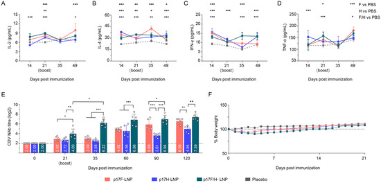 Immunogenicity of DNA-LNP formulations in mice. Mice were intramuscularly immunized with 10 μg of the p17F-LNP, p17H-LNP, bivalent formulation (p17F/H-LNP) in a 0.1-mL volume twice over 21-day intervals, and PBS was set as parallel (Placebo). Serum cytokine production and CDV neutralizing antibody (NAb) at different time points were detected by ELISA and neutralization assays. (A) Detection of IL-2 titers. (B) Detection of IL-4 titers. (C) Detection of IFN-γ titers. (D) Detection of TNF-α titers. (E) Detection of CDV NAb titers. (F) Body weight changes of mice. The horizontal dashed lines indicate the lower limit of detection. Data are presented as mean ± standard error (n = 6). Statistical significance was determined by using a two-tailed unpaired t-test in NAb titers, and a two-way ANOVA test in weight changes. * p < 0.05, ** p < 0.01, *** p < 0.001.