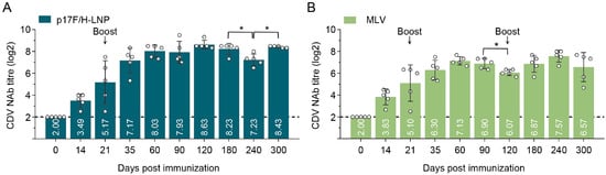 Immunogenicity of p17F/H-LNP formulation in dogs. (A) Beagle dogs were intramuscularly immunized with 100 μg of the p17F-LNP and p17H-LNP bivalent formulation (p17F/H-LNP) in a 0.1-mL volume twice over 21-day intervals. (B) A commercial CDV vaccine (MLV) was immunized with recommend dose twice over 21-day intervals, and boost at day 120 after prime immunization. Serum CDV neutralizing antibody (NAb) at different time points were detected by neutralization assays. The horizontal dashed lines indicate the lower limit of detection. Data are presented as mean ± standard error (n = 6). Statistical significance was determined by using a two-tailed unpaired t-test in NAb titers. * p < 0.05.