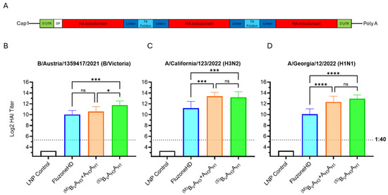 Bi- and trivalent dumbbell antigen designs. (A) Graphic showing the mRNA design for trivalent HA antigens. (B–D) Day 35 serum HAI GMTs (N = 8 per group) against 2024/25 seasonal influenza viruses were determined for LNP Control (200 μL); Fluzone HD (50 μL); BVAH3 + AH3AH1 influenza vaccines expressing membrane (M) B/A and A/A HA bivalent dumbbells (5 μg each); BVAH3AH1 mRNA vaccines (10 μg) expressing secreted (S) trivalent HA dumbbells. Summaries of HAI GMTs and seroconversion rates are included in p < 0.05 (*), p < 0.01 (**), p < 0.001 (***), and p < 0.0001 (****) indicate statistically significant differences; not significant (ns).