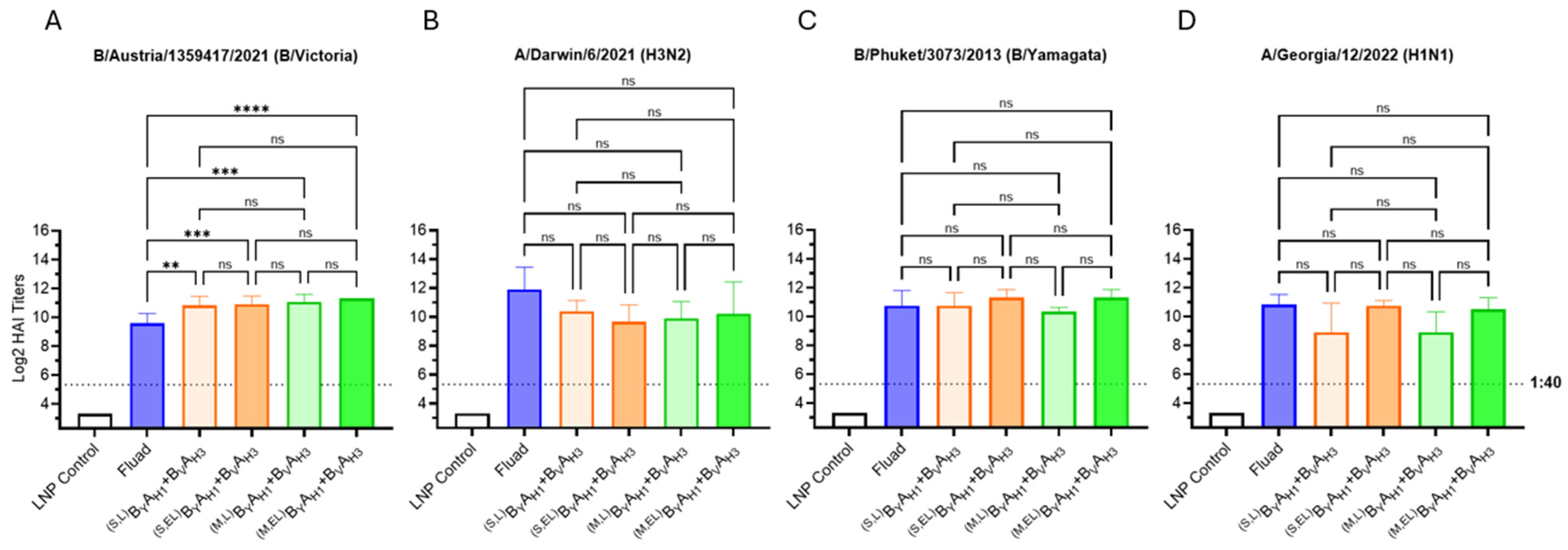 The following supporting information can be downloaded at: https://www.mdpi.com/article/10.3390/vaccines13060628/s1, Supplemental Materials and Methods; Supplemental Tables and Figures: Table S1: Antigen composition, Table S2A–E. Tabulated log2 HAI GMTs, Table S3A,B. Microfluidic mixing for LNP preparation and buffer exchange and concentration of LNPs: key process parameters, Figure S1: IgG and HAI titers, Figures S2–S4: Release and stability testing data for RTU LNP formulation, Figure S5: Encapsulated LNP vs. RTU LNP formulation, Figure S6. Western blot analysis of bivalent and trivalent HA dumbbell antigens; Supplemental Information: Nucleotide Sequence of BVAH3AH1 mRNA, Amino Acid Sequence of BVAH3AH1 Antigen.