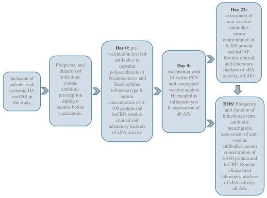 We included 100 sJIA patients in this prospective cohort study, meeting the inclusion and exclusion criteria. The eligible patients were selected voluntarily after 15 years, and their legal representatives were independent of the patient’s age. This study was conducted in the pediatric rheumatology departments of the National Medical Research Center of Children’s Health, Moscow, Russian Federation, and Saint-Petersburg State Pediatric Medical University, Saint Petersburg, Russian Federation, between 2018 and 2020. All patients underwent daily medical observations during the baseline period (Day 0, D0) and three weeks later (Days 1–22, D1–D22). The end-of-study (EOS) observation was conducted six months after the baseline. Day 1 (D1, baseline) was the day of the simultaneous vaccinations. This study’s flow-chart is in Figure 1.