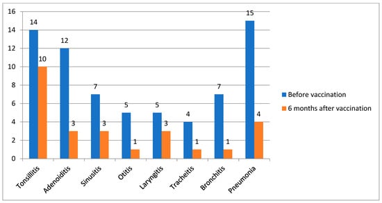 Six months after vaccination, 10/100 patients experienced the following infectious episodes: tonsillitis, 3/100; adenoiditis, 3/100; sinusitis, 1/100; and otitis, 1/100. Nine patients (9%) had respiratory tract infections: laryngitis (3/100), tracheitis (1/100), bronchitis (1/100), and pneumonia (4/100) (Figure 2).