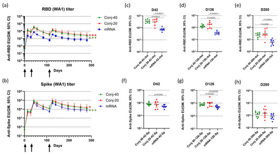 Figure 2a,b show the serum antibody levels against WA1 RBD and full-length Spike protein, respectively, at various time points. The first vaccination induced a strong immune response against RBD, as well as full-length Spike, based on the antibody response measured on day 14, two weeks post vaccination 1 (Figure 2a,b). All animals in the two conjugate groups, as well as the mRNA group, seroconverted after the first vaccination. Antibody responses were further boosted by the second vaccination on day 28, with a 4.0-, 4.1-, and 4.6-fold increase against RBD and a 14.5-, 17.6-, and 12.5-fold increase against full-length Spike, respectively, for the Conj-40, Conj-20, and mRNA groups. A third vaccination on day 112 did not result in increases in antibody levels above the peak levels observed after the second vaccination. Serum antibody levels against RBD were similar for the two conjugate groups but were significantly higher than the mRNA group throughout the period of study. Antibody levels of Conj-40 and Conj-20 were significantly higher than that from mRNA during the course of the study by GEE analysis of repeated measurements (Figure 2a) (p = <0.001 for mRNA vs. Conj-40 and Conj-20), as well as analyses of the three groups at specific time points by Kruskal–Wallis analysis (Figure 2c–e). Even though the geometric mean titers of the two conjugate groups Conj-40 and Conj-20 were not significantly different, the Conj-20 group showed higher variability among the animals within the group. Antibody levels against Spike protein were higher than that against RBD for the mRNA group, as expected, since mRNA codes for full-length Spike. Surprisingly, levels of antibody against Spike were higher compared to RBD for the conjugate groups, as well. Though the difference between the Spike antibody levels in the conjugate and mRNA groups was less pronounced, the conjugate groups still had higher antibody titers compared to the mRNA group after the second vaccination. Anti-Spike antibody titers were significantly higher for both conjugates compared to mRNA by GEE analysis (p < 0.001 for mRNA vs. Conj-40 and p = 0.04 for mRNA vs. Conj-20) (Figure 2b). On day 42 and day 126, sera from Conj-40 and Conj-20 produced significantly higher antibody levels compared to mRNA, whereas the differences were not significant for day 280 sera (Figure 2f–h).