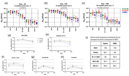 Figure 4a shows the ID50 of day 42 sera for each animal from the conjugate and mRNA groups, measured with different variants. All three groups produced a high ID50 (>17,000 GM titer) against the WA1 virus, indicating strong virus neutralizing activity against this variant. Against the Delta variant, the ID50 of the two conjugates was similarly high as against WA1. The mRNA group had a lower ID50 compared to the conjugate groups, but these differences were not statistically significant. The ID50 of all three groups was substantially lower against Omicron/B.1.1.529, and the mRNA group had a significantly lower ID50 compared to the Conj-40 group. Further reductions in ID50 were observed against the Omicron/BA2.86 and Omicron/EG5.1 variants. Overall, an approximately 2-log decrease in ID50 was observed for all three groups against BA2.86 and EG5.1 compared to WA1. Against Omicron EG 5.1 and BA 2.86, the ID50 of Conj-40 and Conj-20 was similar, and neither was significantly different from the mRNA group. The ID50 values for each group are listed in Supplementary Table S1, and the fold changes in ID50 against different variants compared to WA1 are listed in Supplementary Table S2. The amino acid sequence similarity of Spike and RBD of the different variants used in the virus neutralization assays compared to WA1 are listed in Figure 4i, and the amino acid sequence alignment is shown in Supplementary Figure S2.