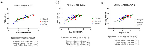 The virus neutralization ID50 from days 42, 126, and 280 against the WA1 virus showed a very strong correlation to the Spike ELISA titer (Spearman r = 0.8293; p = <0.0001) when all three groups were analyzed together (Figure 5a). An equally strong correlation was observed when individual groups were analyzed, yielding a Spearman r of 0.8183 (p < 0.0001), 0.8330 (p < 0.0001), and 0.8548 (p < 0.0001), respectively, for the Conj-40, Conj-20, and mRNA groups. The virus neutralization ID50 showed a strong correlation with the RBD ELISA titer, with a Spearman r = 0.6650 (p < 0.0001) when all three groups were analyzed together. Individual groups also showed a strong correlation, with a Spearman r = 0.6043 (p = 0.0018), 0.6635 (p = 0.0004), and 0.6643 (p = 0.0004), respectively, for the Con-40, Conj-20, and mRNA groups (Figure 5a,b). A similar analysis of the virus neutralization to ACE2 receptor binding inhibition activity of immune sera (ID50) also yielded a very strong correlation (Figure 5c). When all three groups were analyzed together, the Spearman r was 0.8110 (p = <0.0001). When the three groups were analyzed separately, Spearman r values of 0.8730 (p = <0.0001), 0.7843 (p = <0.0001), and 0.9130 (p = <0.0001) were observed against Conj-40, Conj-20, and mRNA, respectively (Figure 5c).