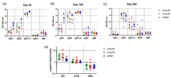 Vaccinations with RBD conjugate and mRNA induce similar IgG subclass profiles: IgG subclass levels in immune sera collected on (a) day 42 (2 weeks post vac 2), (b) day 126 (2 weeks post vac 3), and (c) day 280 (24 weeks post vac 3) from animals vaccinated with Conj-40, Conj-20, and mRNA. Error bars represent the geometric mean with a 95% CI. Since rhesus secondary antibody specific to IgG3 is unavailable, a secondary antibody that binds both IgG1 and IgG3 was used to estimate IgG1+3 levels. (d) shows the ratio IgG1+3/(IgG2+IgG4) for each group that shows a similar transition from a Th1-dominant (IgG1 and IgG3) subclass profile on day 42 to a Th2-dominant (IgG2 and IgG4) profile on day 280, with a balanced Th1/Th2 profile on day 126 for all three groups.