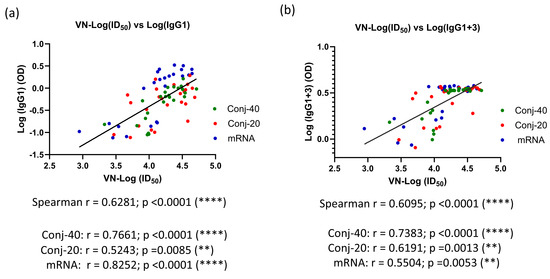 While all four IgG subclasses can inhibit viral entry into cells, cytophilic antibodies IgG1 and IgG3 are efficient in facilitating Fc-mediated activities, such as antibody-dependent cellular cytotoxicity (ADCC), antibody-dependent cellular phagocytosis (ADCP), and complement-dependent cytotoxicity (CDC) that are important for viral clearance. Although vaccination induced an initial immune response dominated by cytophilic antibodies IgG1 and IgG3, the subclass profile switched to a subclass distribution dominated by IgG2 and IgG4 during the 24-week period following the third vaccination. During this period, virus neutralization activity against the WA1 virus also decreased significantly by 4.4-fold from peak activity on day 126 (Supplementary Table S3). Correlation analysis showed a strong positive correlation between virus neutralization activity and IgG1, as well as IgG1+3, levels (Figure 7), whereas no significant correlation was observed with IgG2 and IgG4 levels. This indicates the stronger virus neutralization potential of the cytophilic antibodies IgG1 and IgG3, and their natural waning and class switching following vaccination results in the loss of vaccine-induced protection. Both conjugates and mRNA showed very similar correlations between virus neutralization activity and IgG subclass levels, demonstrating the similarity in the immune response between the two vaccines. The loss of antiviral activity is further exacerbated by escape mutations due to ongoing viral evolution, necessitating updated vaccines targeting current variants [76].