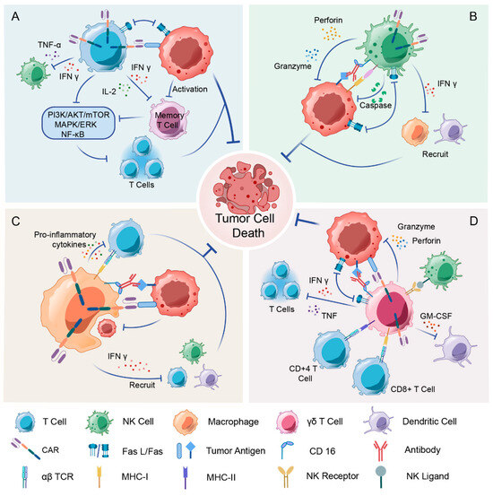 γδ T cells are one of the earliest subpopulations of T cells to develop in the thymus and exhibit both innate and adaptive immunity [63]. γδ T cells account for 1–10% of circulating T cells in the peripheral blood of healthy adults, with Vδ1+ cells enriched in mucosal tissues, whereas Vδ2+ cells are most abundant in the blood and lymphoid organs [64]. The activation of γδ T cells is mediated through multiple pathways, including TCR signaling in combination with co-stimulatory cytokines (e.g., IL-15 and IL-18), as well as through engagement of NK cell receptors such as NKG2D. Members of the lactophilin and lactophilin-like (BTN/BTNL) family are key sensing factors for phosphoantigens in Vγ9δ2 cells, with BTN3A1 most widely recognized as an activator of the Vγ9Vδ2 subset of γδ T cells [65]. Activated γδ T cells have multiple killing mechanisms (Figure 2), including direct killing of target cells by a mechanism similar to that of αβ T cells and NK cells, as well as secretion of cytokines such as IL-17, IL-13, and IFN-γ, which indirectly contribute to the antitumor response [66]. In addition, Vδ2+ T cells can act as antigen-presenting cells to present antigen to αβ T cells with at least as much efficiency as DCs [67].