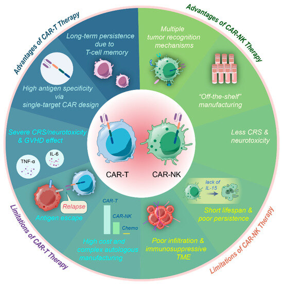 CAR-NK therapy also boasts a safety profile that is unparalleled by CAR-T therapy. Conventional CAR-T therapy typically involves the collection and genetic modification of autologous T cells, a process that is often time-consuming and inefficient. Moreover, allogeneic transplantation of CAR-T cells can lead to severe graft-versus-host disease (GVHD). In contrast, NK cells are not restricted by MHC molecules, and therefore, they do not induce GVHD [20]. This feature is particularly significant, considering that the cytotoxicity of patients’ own NK cells is often diminished after chemotherapy, necessitating allogeneic transplantation in most CAR-NK therapy scenarios. Moreover, CAR-T cells are highly susceptible to inducing cytokine release syndrome (CRS) through the substantial release of TNF-α, IL-1β, and IL-6 upon targeting tumor antigens. CAR-NK cells initiate anti-tumor activity through direct cell death. The release of neoantigens and the production of dominantly produced IFN-γ following target cell lysis do not trigger CRS [21]. Moreover, CAR-T cells may cause “on-target/off-tumor toxicity” due to the lack of tumor-specific antigens [22].