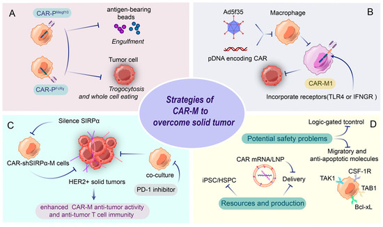 Challenges of CAR-M and engineering strategies to overcome solid tumors. CAR-M cells are engineered to enhance phagocytic activity and antitumor immunity through multiple strategies: (A) CAR constructs (e.g., CAR-PMegr10/PFcRγ) enable targeted engulfment of antigen-bearing tumor cells and beads, while trogocytosis facilitates whole-cell clearance. (C) Phagocytosis checkpoint. Silencing SIRPα disrupts the “don’t eat me” signal, amplifying tumor cell phagocytosis; additionally, combining CAR-M with PD-1 inhibitors augments T cell immunity in HER2+ solid tumors. (B) iPSC/HSPC-derived CAR-M, delivered via Ad5f35 or plasmid DNA, are polarized toward pro-inflammatory M1 phenotypes through TLR4/IFNGR signaling, enhancing cytokine secretion (e.g., IL-12) and stromal degradation. (D) Logic-gated controls and anti-apoptotic molecules (Bcl-xL, TAK1/TAB1) address safety risks, though challenges persist in migratory regulation and CSF-1R-mediated TME interactions. These integrated approaches position CAR-M as a versatile tool for overcoming solid tumor resistance.
