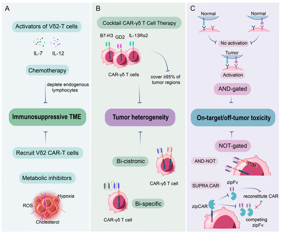 CAR-γδ T: challenges and strategies towards solid tumors. CAR-γδ T cell therapy employs combinatorial approaches towards solid tumors: (A) Immunosuppressive TME: activation of Vδ2 T cells via IL-7/IL-12 or chemotherapy-induced lymphodepletion enhances tumor targeting, while metabolic inhibitors (ROS, cholesterol) counteract immunosuppressive TME. (B) To solve the antigen escape problems, multi-antigen “cocktail” (B7-H3, GD2, IL-13Ra2, “Bi-cistronic”, “Bi-specific”, and “OR-gated”) strategies are used. (C) Logic-gated systems (AND/NOT) restrict activation to tumor-specific dual-antigen profiles, minimizing on-target/off-tumor toxicity. Innovations like bi-cistronic/bispecific CARs and SUPRA CAR systems further refine specificity and safety. These strategies collectively enhance precision and adaptability, positioning CAR-γδ T cells as a robust platform for heterogeneous solid tumors.
