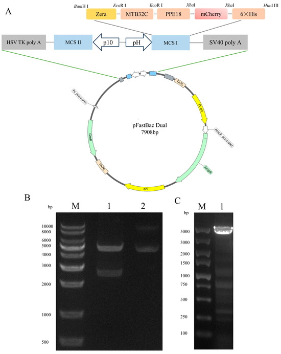 The recombinant plasmid designated pFastBac Dual-Zera-MTB32C-PPE18-mCherry (abbreviated as pFastBac Dual-Zera-71CA-mCherry; see Figure 1A) was successfully constructed through gene synthesis of the MTB32C and PPE18 sequences. These synthesized genes were subsequently cloned into the vector using a double restriction enzyme digestion strategy, the results of which are illustrated in Figure 1B. The accuracy of the gene insertion and orientation was further confirmed through DNA sequencing analysis. To verify that the target gene was successfully integrated into the bacmid, colony PCR amplification was performed using the universal M13 primer. The appearance of the expected amplification product indicated a correct construction (Figure 1C), and the recombinant bacmid was named Bacmid-Zera-71CA-mCherry.