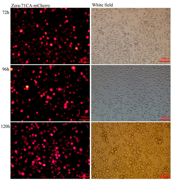 Sf9 cells (stored in our laboratory), maintained in our laboratory, were cultured at 27 °C in Sf-900 II serum-free medium (SFM) (Gibco, Grand Island, NY, USA). Zera-71CA-mCherry was cloned and inserted into the pFastBac dual vector (Invitrogen, Carlsbad, CA, USA) using the BamHI and HindIII nucleic acid restriction sites (NEB, Beijing, China), and the obtained recombinant plasmids and pFastBac dual (negative control) were subsequently transformed into DH10Bac E. coli cells (Biomed). Positive clones were screened using blue–white selection and verified by sequencing, with the resulting constructs named Bacmid-Zera-71CA-mCherry and Bacmid-Dual, respectively. These bacmids were transfected into Sf9 cells using TransIT®-LT1 Transfection Reagent (Mirus) [14]. Following the manufacturer’s protocol, the fluorescence was observed at 72, 96, and 120 h post-transfection using a Nikon Eclipse TE2000-U inverted fluorescence microscope (Tokyo, Japan).