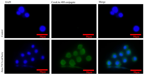 To observe the subcellular localization of the fusion protein Zera-71CA-mCherry in infected Sf9 cells, cells were infected with Zera-71CA-mCherry recombinant nanoparticles at a multiplicity of infection (MOI) of 0.5. After infection, cells were fixed on slides using 4% paraformaldehyde and subsequently blocked with 5% bovine serum albumin for 2 h. Mouse anti-His monoclonal antibodies (Abcam, Shanghai, China, 1:500 dilution) were then applied and incubated overnight at 4 °C. Following PBS washes to remove unbound primary antibodies, CoraLite 488-conjugated goat anti-mouse IgG secondary antibody (Proteintech, Wuhan, China, 1:500 dilution) was added and incubated for an additional 2 h. After washing with PBS, DAPI was added dropwise and incubated at room temperature for 10 min. Fluorescence imaging was performed using a laser confocal microscope (Leica TCS SPE, Wetzlar, Germany). To further determine the subcellular localization of the fusion protein, Zera-71CA-mCherry, cells were examined using a transmission electron microscope operated at 80 kV (Hitachi H-7650, Tokyo, Japan).
