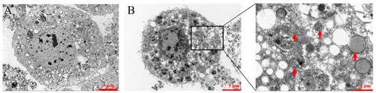 Sf9 cells transfected with Zera-71CA-mCherry were examined at 72, 96, and 120 h with different fields of view (white, red) and positive cells were identified by indirect immunofluorescence. The results showed that the antigen was localized to the plasma membrane of the infected Sf9 cells or highly enriched in its vicinity (Figure 2 and Figure 3). To determine whether the antigen could trigger PB formation, Zera-71CA-mCherry nanoparticles were examined by electron microscopy, as shown in Figure 4. The presence of abundant electron-dense organelle PBs was observed in Sf9 cells, and these dense vesicles were of different sizes (0.5–1.2 μm).