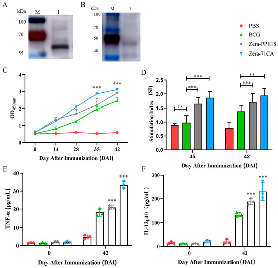 Western blot and immunogenicity assessment of the recombinant Zera nanoparticles in mice. (A) Western blotting of the recombinant Zera nanoparticle Zera-71CA (65.8 kDa). (B) Western blotting of the recombinant Zera nanoparticle Zera-PPE18 (52.8 kDa). (C) Indirect ELISA showing the immune response induced by recombinant Zera nanoparticles in mice. The y-axis represents the optical density (OD) at 450 nm for the serum samples collected at 0, 14, 28, 35, and 42 days after immunization (DAI) for each group. (D) Lymphocyte proliferation assay results. The y-axis indicates the stimulation index of splenic lymphocytes collected at 35 and 42 DAI. ns: not significant; ** p < 0.01, *** p < 0.001, indicating statistically significant differences (one-way ANOVA with Bonferroni correction). Quantification of the TNF-α (E) and IL-12p40 (F) levels in the sera of immunized mice. All experiments were performed in triplicate, and error bars represent the standard deviation (SD) (n = 3).
