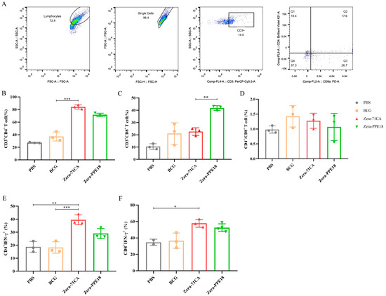 Forty-two days after immunization, the spleens of the mice were collected in a sterile environment, and the mouse splenic lymphocytes (Dakewe) were isolated and inoculated in 6-well plates with 1 × 106 mouse splenocytes per well and stimulated with 5 μg/mL of Zera-71CA/Zera-PPE18 and 100 μL of PBS for 12 h. For the staining of the cell surface, the following antibodies (Proteintech) were used: CoraLite®Plus 405 Anti-Mouse CD4 (GK1.5), PE Anti-Mouse CD3 (17A2), and CoraLite®Plus 705 Anti-Mouse CD8a (53-6.7). Subsequently, the cells were fixed, permeabilized, and stained for intracellular cytokines using CoraLite®Plus 647-conjugated Anti-Mouse IFN-γ (XMG1.2) antibodies. The stained cells were then analyzed using a SONY MA900 flow cytometer, and the data were processed with FlowJo version 10 software (Tree Star Inc., Ashland, OR, USA).