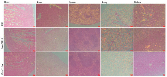 After administering the Zera-71CA/Zera-PPE18 vaccine, no noticeable inflammatory responses or organ damage were observed in the major organs of mice, such as the heart, liver, spleen, lungs, and kidneys. Histological analysis showed that the tissue structure remained intact, with no evidence of cell necrosis, inflammatory infiltration, or abnormal cell growth. These results indicated that the vaccine is biocompatible and safe (Figure 7).