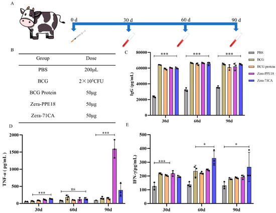 Evaluation of immunogenicity in calves. (A) Immunization protocol for calves; (B) determination of groups and doses; (C) analysis of IgG responses induced in immunized calves determined by indirect ELISA. * p < 0.05, *** p < 0.001, significant difference (one-way ANOVA with Bonferroni correction). Quantitative analysis of TNF-α (D) and TNF-γ (E) concentrations in serum of vaccinated calves. All analyses were performed in triplicate, and error bars show standard deviation (SD) (n = 3).