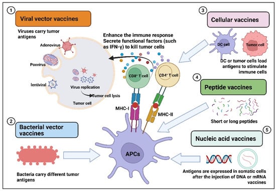 Tumor vaccines are those that deliver tumor antigens, such as lysed tumor cells, tumor-associated proteins or peptides, RNA or DNA expressing tumor antigens, into the patient’s body to activate the immune response and exert anti-tumor effects [5,6,7,8]. Tumor vaccines are divided into preventive tumor vaccines and therapeutic tumor vaccines. Preventive tumor vaccines are mainly designed against the pathogens that cause tumors, such as the HPV vaccine for preventing cervical cancer [9,10]. Multiple HPV vaccines have been clinically approved globally. For example, the bivalent vaccine (2vHPV): Cervarix®, the quadrivalent vaccine (4vHPV): Gardasil®, and the nonavalent vaccine (9vHPV): Gardasil9®. Therapeutic cancer vaccines are mainly designed for tumor antigens (tumor-associated antigens, specific antigens), stimulating the body to produce specific immune responses to kill tumors. Such vaccines have the characteristics of broad-spectrum and personalization and have important advantages and significance. For therapeutic cancer vaccines, several marketed products have been launched, such as the BCG vaccine (TheraCys®), the dendritic cell vaccine Provenge®, the oncolytic herpesvirus vaccine (Imlygic®), and the peptide vaccine (Cimavax®), which are used to treat prostate cancer, melanoma, and renal cell carcinoma. So far, there are still many therapeutic cancer vaccines under research and development worldwide, mainly including viral vector type, bacterial vector type, cell vector type, peptide type, and nucleic acid type. Various therapeutic cancer vaccines combat tumors by directly killing or enhancing the immune response (Figure 1). For viral vector tumor vaccines, they exert anti-tumor effects through multiple pathways. For example, the direct oncolytic effect is that after the virus invades tumor cells, it replicates in large quantities and eventually lyses the tumor cells [11,12,13]. In addition, viral vector vaccines also inhibit tumors by activating immune responses, altering the tumor microenvironment, and disrupting the blood supply to tumors [14,15,16,17,18,19]. Bacteria also have their unique advantages as delivery carriers. For instance, bacterial vaccines loaded with drugs can spontaneously target and colonize tumor tissues after being absorbed [20]. Vaccines based on bacterial vectors present antigens carried by APCs and are recognized by T cells, which activate CD4+ and CD8+ T cells, thereby enhancing the immune response and inducing apoptosis of tumor cells [20,21,22,23,24]. The mechanism of action of cell vaccines is to introduce tumor antigens or immune-stimulating molecules into the patient’s body through cell vectors, activate the patient’s own immune system, and induce an immune response to achieve the purpose of controlling or eliminating tumors [25,26,27,28,29]. With the development of molecular biology techniques, the tumor antigens recognized by the immune system have been identified. Designing and developing synthetic peptides corresponding to the antigenic epitopes of tumor-reactive lymphocytes has become an important means of treating tumors. Designing peptide-based vaccines to stimulate anti-tumor T-cell responses has many advantages, such as ease of manufacturing and quality control, as well as showing good safety in existing clinical studies [30]. For effective peptide tumor vaccines, their anti-tumor mechanism of action depends on activated CD8+ and CD4+ T cells [31,32,33]. Nucleic acid vaccines include two types: DNA vaccines and mRNA vaccines. For DNA vaccines, DNA needs to be transported to the cell nucleus for transcription and then translated into the cytoplasm [34]. Vaccines based on mRNA can be directly expressed in the cytoplasm of transfected cells [35]. Nucleic acid vaccine antigens rely on somatic expression and release and then transfer to local APCs for presentation, activating CD8+ and/or CD4+ T cells [36]. The main indications of various therapeutic cancer vaccines include prostate cancer, lung cancer, glioblastoma, melanoma, breast cancer, liver cancer, etc. [7,37,38,39,40,41,42]. With the continuous advancement of technology, tumor immunotherapy has developed rapidly and has become a research and development hotspot in the field of tumor treatment. This article will focus on systematically discussing the current research and development status of various therapeutic cancer vaccines and the updated related clinical research progress in the past five years, aiming to provide strategies and new ideas for the research and transformation of tumor therapeutic vaccines.