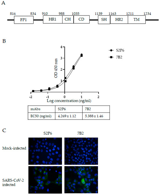 Generation of S protein-specific mAbs with S2 subunit fragment of SARS-CoV-2 S protein. (A) Schematic diagram showing functional motifs in S2 subunit of SARS-CoV-2 S protein. Abbreviations: FP-fusion peptide; HR1-heptad repeat 1; CH-central helix; CD-connector domain; SH-stem helix; HR2-heptad repeat 2; TM-transmembrane. (B) Binding of mAbs S2P6 and 7B2 to SARS-CoV-2 S protein and their respective EC50 were determined by ELISA. A representative plot from three independent experiments is shown and error bars correspond to standard deviations (SD) of each mAb experiment carried out in triplicate. (C) Vero-E6 cells were mock-infected or infected with SARS-CoV-2 at MOI of 5. At 24 hpi, infected cells were stained with mAbs S2P6 and 7B2 at 2 µg/mL, followed by AF-488-conjugated secondary antibody. Nuclei were counterstained with DAPI. Images were captured using fluorescent microscope.