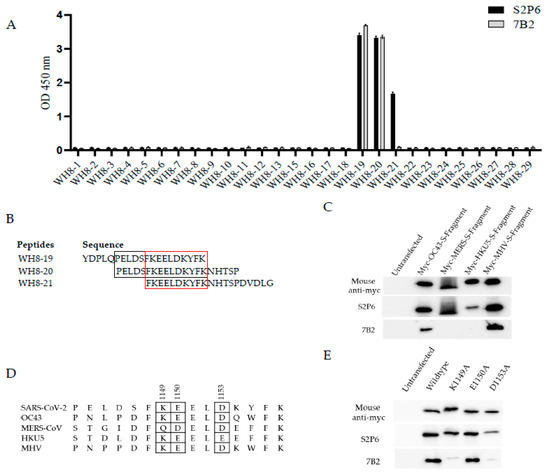 The whole ectodomain of the SARS-CoV-2 WT S protein with His tag ((#40589-V08B1, Sino Biological) was diluted with coating buffer (0.1 M NaHCO3, 34 mM Na2CO3) and 50 ng of protein was coated into individual wells of a 96-well plate (Thermo Fisher Scientific) overnight at 4 °C. Plates were washed three times with 0.05% Tween 20 in PBS (PBST) and blocked with blocking buffer (5% FBS in PBST) for 1 h incubation at 37 °C. The mAbs were diluted with blocking to indicated concentration and added to desired wells for 2 h at 37 °C. HRP-conjugated secondary antibody diluted in blocking buffer was added for 1 h incubation to each well after three washes with PBST. Visualization of bound antibodies was performed by the addition of 3,3′,5,5′-tetramethylbenzidine (TMB) substrate (Thermo Fisher Scientific) for 2 min and the reaction was stopped with 2 N sulphuric acid. Optical density at 450 nm (OD450 nm) was measured using Tecan Infinite M1000 plate reader (Männedorf, Switzerland). For peptide mapping, 10 µg/mL of synthetic 20-mer overlapping peptides (WuXi AppTec (Hong Kong) Limited) were coated on 96 well plates using coating buffer overnight at 4 °C. Coated plates were washed three times with PBST and blocked with blocking buffer for 1 h at 37 °C. A measure of 30 ng/mL of mAbs diluted in blocking buffer was added to the desired wells for 2 h incubation at 37 °C. After three washes with PBST, HRP-conjugated secondary antibody diluted in blocking buffer was added, followed by 1 h incubation at 37 °C. The plates were washed again with PBST and bound antibodies were visualized after the addition of TMB and 2 N sulphuric acid. Absorbance at 450 nm was determined using Tecan Infinite M1000 plate reader.