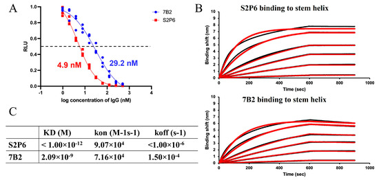 Inhibition on membrane fusion and binding with stem helix of 7B2 and S2P6. (A) 7B2 and S2P6 were tested in cell–cell fusion assay, displaying inhibitory activity with IC50 of 29.2 nM and 4.9 nM, respectively. (B) Binding of 7B2 and S2P6 upon stem helix was evaluated using BLI assay. Sensorgrams were acquired with the antibody at varied concentrations, 1, 2, 10, 20, 50 and 100 nM. Experimental data is displayed in black, with fitting curves displayed in red. (C) Dissociation constant KD, association rate kon and dissociation rate koff quantified based on the BLI assay are summarized in the table.