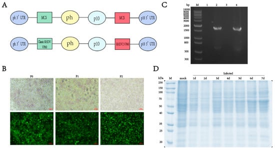 Sf9 cells were seeded in six-well plates at 40–50% cell confluency, and the recombinant baculovirus was inoculated at 3 MOI. The viral genome was extracted from sf9 cells that were infected with recombinant baculovirus, according to the instructions of the Tiangen Virus Genome Extraction Kit (Beijing, China), and it was detected via PCR using the following forward and reverse primers shown in Table 1. Sf9 cells were lysed using insect cell protein extraction reagent (Thermo Fisher Scientific, Waltham, MA, USA). After centrifugation at 12,000 rpm for 30 min at 4 °C, both the supernatant and pellet fractions were collected. Samples were resolved via 10% SDS-PAGE and electrotransferred onto polyvinylidene fluoride (PVDF) membranes, sealed with 2.5% skimmed milk powder and incubated with His-tag antibody overnight at 4 °C. HRP-conjugated goat anti-mouse was used as the secondary antibody, and the blot was developed using picoLight enhanced chemiluminescence (Epizyme, Shanghai, China).