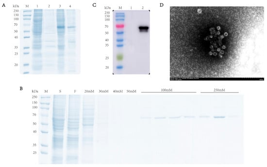 To characterize the expression profile of the RHDV VP60 protein, supernatant and pellet fractions from lysed baculovirus-infected sf9 cells were analyzed via SDS-PAGE (10% gel) under reducing conditions. The results showed that there was a specific 60 kDa band in the supernatant, which indicated the VP60 protein found in the soluble fraction, while its presence in the pellet may have been due to incomplete cell lysis (Figure 2A). Western blotting confirmed protein expression in infected cells but not in uninfected cells (Figure 2B). After ultrasonication lysis, the supernatant was purified via Ni-NTA chromatography, and SDS-PAGE showed VP60 protein appearance at 60 kDa under 100 mM imidazole elution, with more protein with 250 mM imidazole (Figure 2C). To confirm VP60 protein self-assembly into VLPs, the purified protein was dialyzed overnight and negatively stained with phosphotungstic acid for transmission electron microscopy analysis. The results showed that VP60 protein formed a nucleic-acid-free, 33–40 nm-diameter hollow particle (Figure 2D). These results indicate successful RHDV VLP expression using the baculovirus expression system.