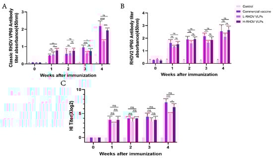 Antibodies against the RHDV VP60 protein in the host can effectively inhibit RHDV infection. To evaluate the chimeric RHDV VLP vaccine’s ability to induce humoral immunity, we used a commercial RHDV antibody ELISA assay kit and a 96-well plate coated with the RHDV2 VP60 protein antigen to detect anti-RHDV VP60 antibodies in rabbit serum via ELISA. We purchased a commercial baculovirus vector inactivated vaccine for the positive control group. Both high-dose and low-dose RHDV VLP vaccine groups and the commercial vaccine group induced anti-RHDV VP60 antibody production, while the negative control group did not. After one week of immunization, the classic RHDV VP60-specific antibody produced in the commercial vaccine group was lower than that in the high-dose group, but the lower-dose group did not differ significantly. After booster immunization, both the chimeric RHDV VLP vaccine group and the commercial vaccine group had significantly increased classic RHDV VP60-specific antibodies, and there was no significant difference between the high-dose group and the commercial vaccine group (Figure 3A). After primary immunization, the production of RHDV2 VP60-specific antibodies was higher than that of classic RHDV VP60-specific antibodies (Figure 3A,B), but there was no significant difference between the groups during the immune cycle (Figure 3B). The HI assay showed that all immunized groups except the control group had virus-neutralizing ability one week after immunization, which reached the highest level after the second dose, with no significant difference between the high-dose group and the commercial vaccine group (Figure 3C). The results showed that the effect of the vaccine in the high-dose group was similar to that of the commercial vaccine.