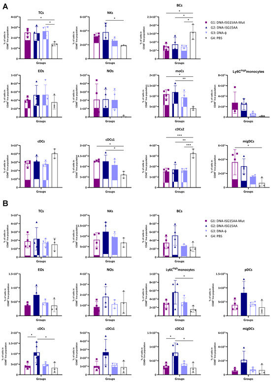 Recruitment of innate immune cells in muscle and DLNs following immunization with DNA-based vectors expressing ISG15 variants. Female C57BL/6 mice were immunized i.m. with plasmid DNA vectors encoding wild-type ISG15AA or a 1:1:1 mixture of secretion-deficient ISG15AA mutants (M70A, S81A, L83F). Immune cell subsets in muscle (A) and DLNs (B) were analyzed by flow cytometry 4 days after injection. Data are presented as mean ± SD. Cell subsets analyzed include TCs, T cells; NKs, natural killer cells; BCs, B cells; Eos, eosinophils; Nos, neutrophils; moCs, monocyte-derived cells; pDCs, plasmacytoid dendritic cells; cDCs, conventional dendritic cells; migDCs, migratory dendritic cells. *, p < 0.05; **, p < 0.005; ***, p < 0.001.