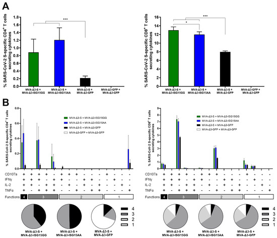 To analyze the impact of ISG15 in MVA-Δ3-S vaccination against SARS-CoV-2, four groups of female C57BL/6JOlaHsd mice (6–8 weeks old; n = 5/group) were immunized i.m. with 5 × 106 PFUs of MVA-Δ3-S co-administered with 5 × 106 PFUs of MVA-Δ3 expressing ISG15GG (MVA-Δ3-ISG15GG), ISG15AA (MVA-Δ3-ISG15AA), or GFP (MVA-Δ3-GFP) as a control group. MVA-Δ3-S encodes a full-length native non-stabilized SARS-CoV-2 antigen [29]. Immunizations were administered on days 0 (prime) and 14 (boost). At day 10 post-boost, splenocytes were isolated and stimulated ex vivo with peptide pools spanning SARS-CoV-2 S protein. The magnitude, breadth, and polyfunctionality of SARS-CoV-2 S-specific CD4 and CD8 T-cell responses were assessed by ICS, as previously described [29], and similar to the process described above.